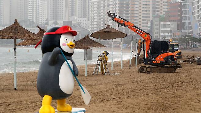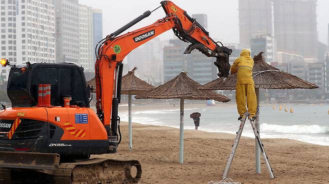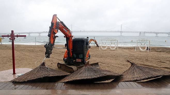 파라솔이 철거되고 있는 부산 광안리해수욕장
