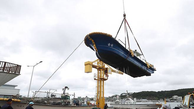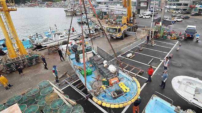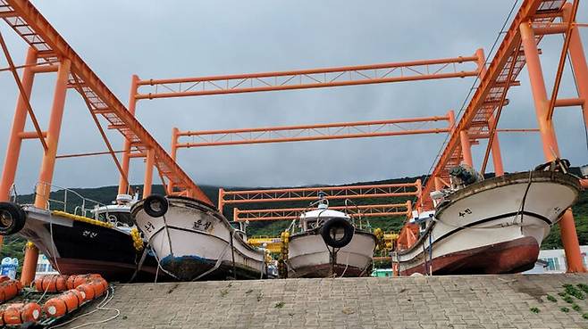 [포토] 육지로 옮겨지는 어선..태풍 '힌남노' 북상에 긴장 고조
