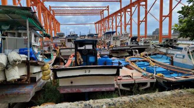2일 오후 전남 신안군 흑산면 가거도에서 제11호 태풍 '힌남노' 북상에 대비해 어민들이 어선을 육지로 올려놓았다.