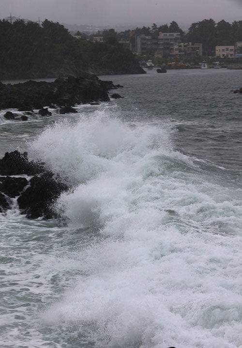 태풍 '힌남노'가 북상 중인 가운데 제주 서귀포시 표선면 토산리 해안에 파도가 몰아치고 있다.