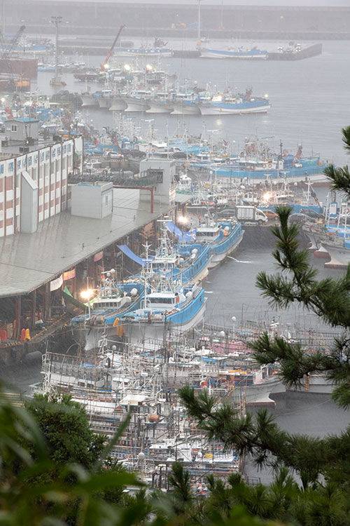 어민들이 어선을 육지로 올려놓으면서 항구가 비어있는 모습.
