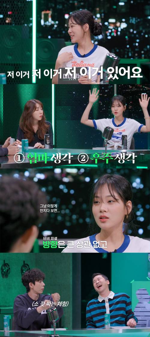 이에 비비는 "저 이거 저 이거 저 이거 있다. 슬픈 젖꼭지 증후군이다. 근데 계속 자극(?)이 가면 진짜 어떤 생각이 드냐면... 엄마 생각나고, 우주 생각이 난다. 되게 우울해지고 약간 '히이잉...'"이라고 고백했다.