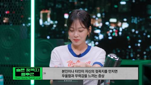 이에 비비는 "저 이거 저 이거 저 이거 있다. 슬픈 젖꼭지 증후군이다. 근데 계속 자극(?)이 가면 진짜 어떤 생각이 드냐면... 엄마 생각나고, 우주 생각이 난다. 되게 우울해지고 약간 '히이잉...'"이라고 고백했다.