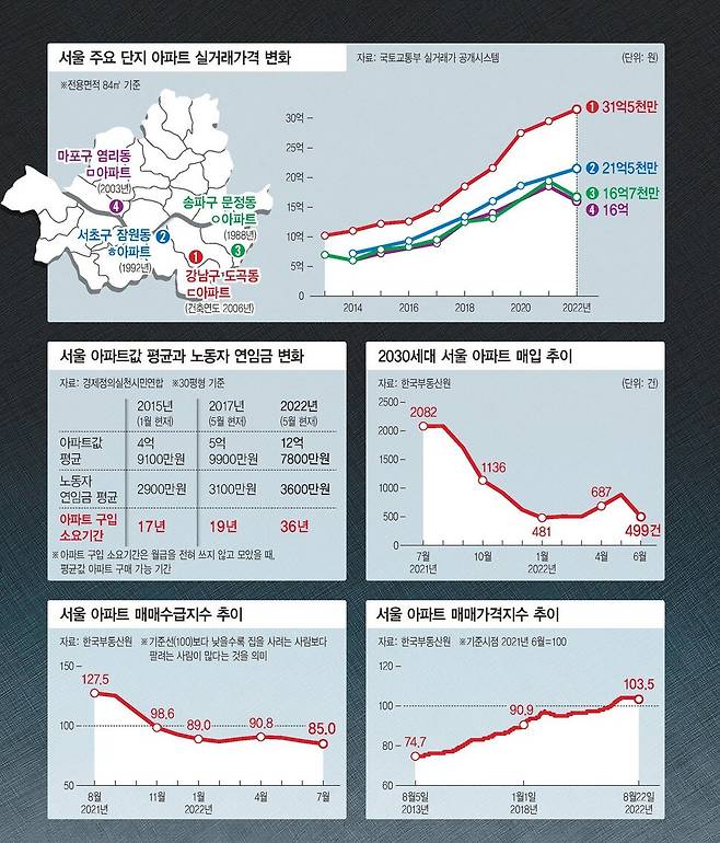 ㅈ씨 부부는 맞벌이로 악착같이 모아 한해 최대 4천만원까지 저축한다는 계획이다. 아이가 태어나 학교에 들어가기 전까지 어떻게든 집을 마련하기 위해서다. 하지만 현재 인근 실거주 공간 30평대 브랜드 아파트 호가는 15억원을 훌쩍 넘는다. ㅈ씨는 “한해 4천만원 저축도 꿈같은 얘기지만, 쉰살 넘을 때까지 20년을 그렇게 모아야 직장 근처 집을 살 수 있다는 게 비현실적인 느낌”이라며 한숨을 쉬었다. 그는 “요즘 집값이 떨어진다고 해서 부동산 뉴스를 매일 검색하다시피 한다”며 “비슷한 처지의 사람들이 ‘높’이란 말을 뒤집으면 ‘푹’이라면서 집값이 크게 떨어질 거라고 기대하는데, 집값이 상식적인 선으로 돌아갔으면 하는 바람”이라고 말했다.