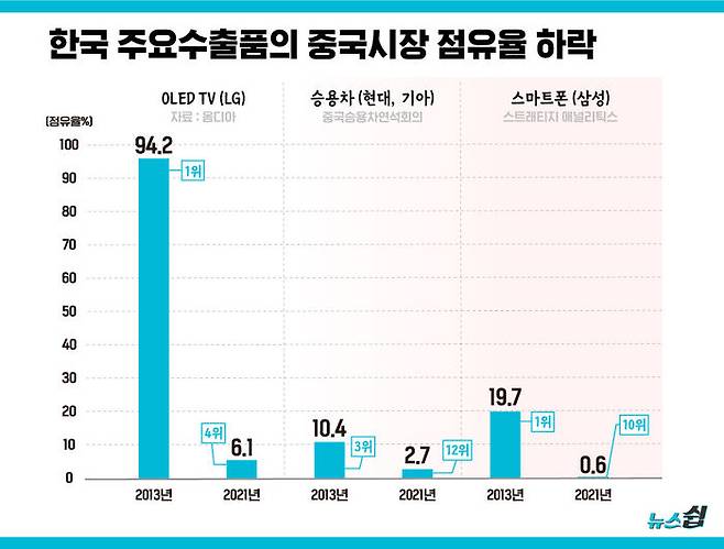 아예 정치적인 이유로 기업이 직격탄을 맞기도 한다. 현대차는 2016년 중국에서 114만 대를 팔며 역대 최대 판매량을 찍었다. 중국 시장이 더 커질 것으로 보고, 이듬해인 2017년 우리돈 약 1조6천억 원을 투자해 연산 30만 대 규모의 충칭 공장을 지었다. 하지만 사드 보복과 한한령 사태 이후 중국인의 반한감정이 커지면서 2017년에는 판매량이 80만대 아래로 급감했다. 2021년엔 또 절반으로 줄어 38만여 대에 불과했다. 이미 2019년에 중국에 지었던 첫 공장의 가동을 중단했고, 그나마 지난해에는 중국업체에 이 공장을 넘겼다. 올 초에는 충칭공장의 가동을 중단했다. 기아도 2016년 판매량이 최대(65만대)로 올랐다가 2017년에 반토막이 났고 2021년엔 거기서 또 반토막이 났다.