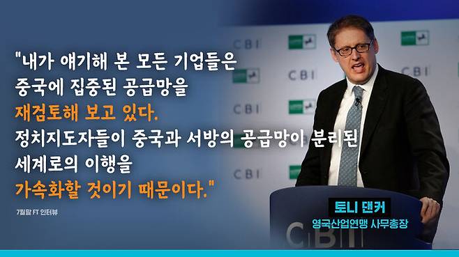 19만여개의 영국 기업들을 대변하는 조직인 영국산업연맹의 토니 댄커 사무총장은 지난 7월말 파이낸셜타임스 인터뷰에서, "내가 얘기해 본 모든 기업들은 중국에 집중된 자신들의 공급망을 다시 검토해보고 있다."고 말했다. 중국과 서방의 공급망 분리가 가속화할 것이기 때문이라는 것이다.