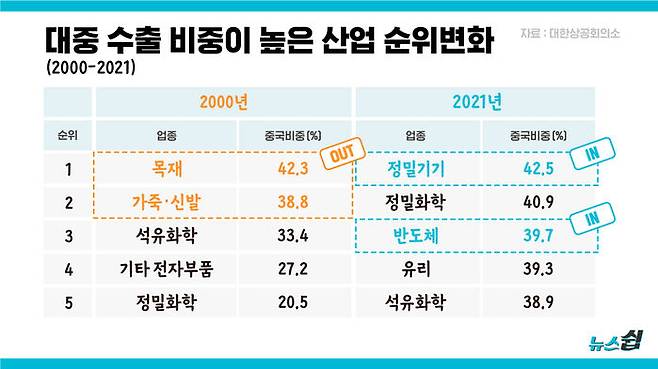 2000년에는 합판 등 목재, 가죽, 신발 등의 품목에서 전체 수출 중 대중수출 비중이 높았다. 반면 2021년의 목록에서는 이들 업종이 사라졌고, 정밀기기, 정밀화학, 반도체가 들어왔다. 2021년 반도체 수출 물량의 39.7%가 중국으로 갔다.