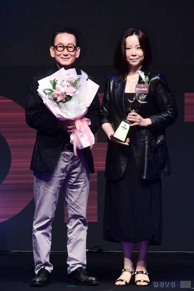 한국소비자브랜드위원회가 주최하고 한국경제신문, 한국소비자포럼이 주관하는 '2022 올해의 브랜드 대상' 시상식이 2일 오후 서울 장충동 신라호텔에서 열렸다. 올해의 쿠션파운데이션 부문을 수상한 한국시세이도(브랜드명 나스) 은선영 이사가 이장우 한국소비자포럼 기업위원장과 포즈를 취하고 있다.
