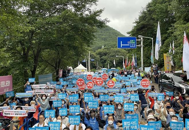 [성주=뉴시스] 박홍식 기자 = 사드 철회 성주대책위와 주민 600여 명이 3일 오후 경북 성주군 초전면 소성리 진밭교 일대에서 '불법사드 원천무효'를 주장하며 대규모 집회를 열고 있다. (사진=사드철회 소성리 종합상황실 제공) 2022.09.03 photo@newsis.com