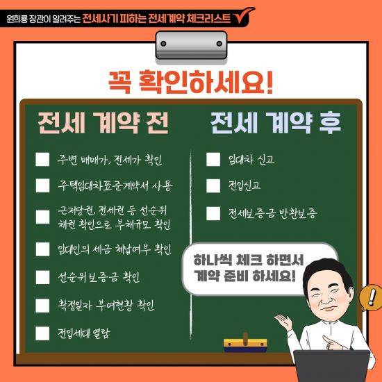 먼저 계약 전에는 ▲주변 매매가·전세가 확인 ▲주택임대차표준계약서 사용 ▲근저당권·전세권 등 선순위 채권 확인 ▲임대인의 세금 체납여부 확인 ▲선순위 보증금 확인이 필요하다.