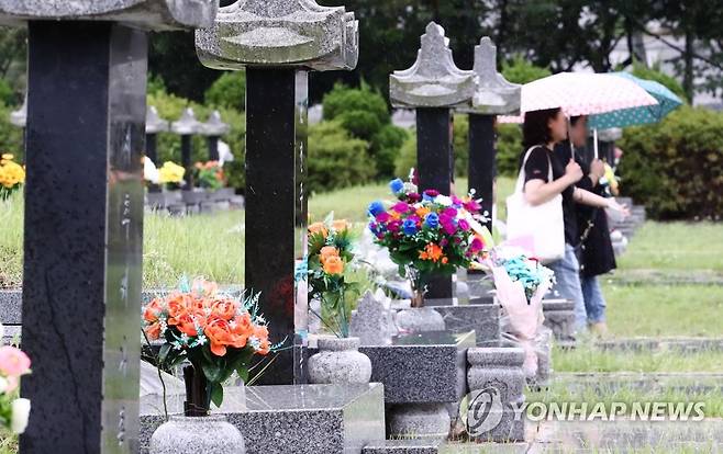 (인천=연합뉴스) 김상연 기자 = 제11호 태풍 '힌남노' 북상 중인 4일 인천시 부평구 인천가족공원에서 성묘객들이 우산을 쓰고 묘소를 지나가고 있다. 2022.9.4