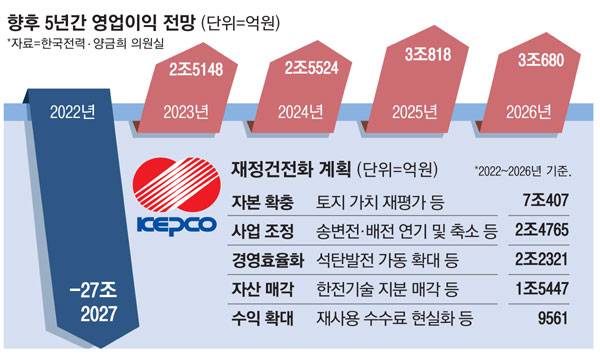 계획안에 따르면 한전은 원유·가스 등 국제 에너지 가격 상승 영향 등으로 올해 영업손실이 27조2027억원에 달할 것으로 예상했다. 이는 국내 증권사 평균 전망치(28조8423억원)에 비해 다소 낮은 수치다.