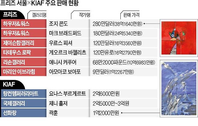 원혜경 선화랑 대표는 “곽훈의 1억2000만원짜리 회화 작품이 첫날 팔리는 등 판매 성적은 지난해와 비슷하다”며 “단색화 이후 새로운 한국 작품을 찾는 해외 갤러리스트와 컬렉터들의 문의와 발길이 끊이지 않았다”고 말했다. 오현금 토포하우스 대표는 “KIAF를 프리즈 서울과 공동 개최한 덕분에 국내는 물론 해외 미술애호가들에게 한국 미술을 더 많이 알릴 수 있는 계기가 된 것 같다”며 “잘 활용하면 한국 화랑이 세계로 뻗어나가는 기회가 될 수 있을 것”이라고 했다.