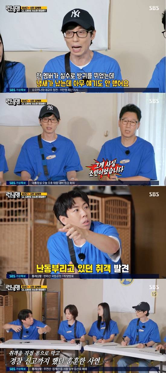 하지만 지석진은 "못 잡았다"고 답변했고 멤버들은 "그럼 그냥 쫓아간 거 아니냐", "못 잡았으면 미담이 아니다"라며 폭소했다.