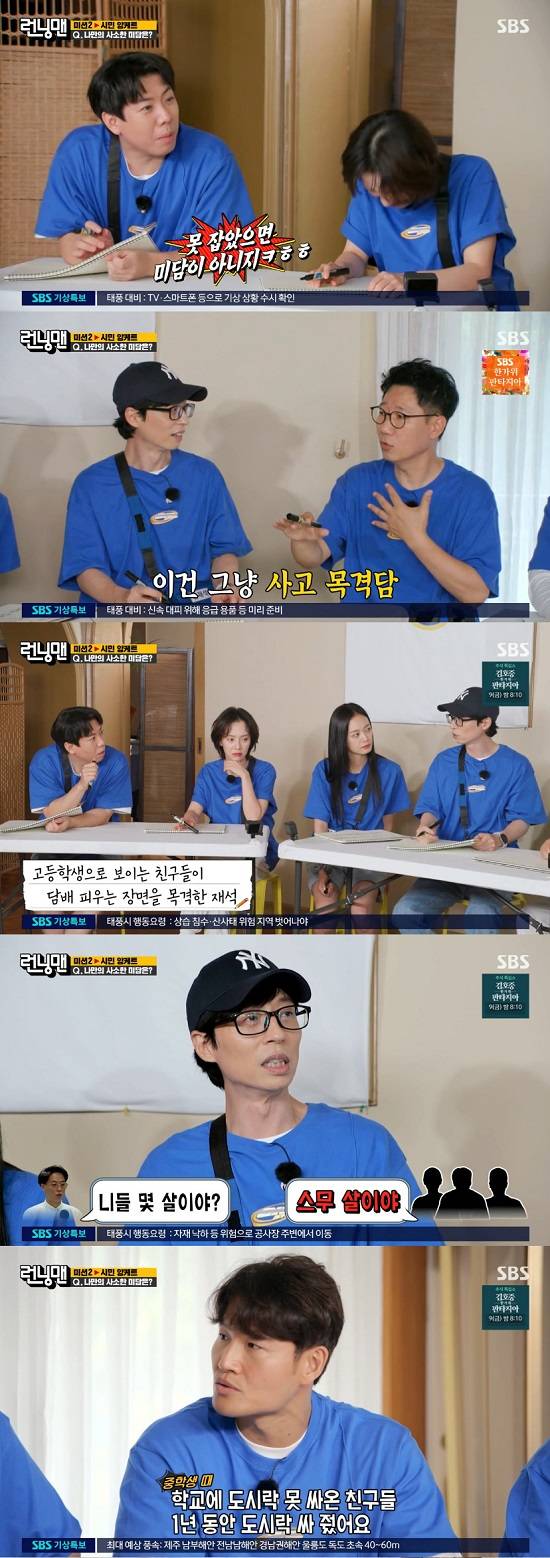 4일 방송된 SBS 예능 프로그램 '런닝맨'에서는 '시민 앙케트' 미션이 펼쳐졌다. 멤버들은 제시된 질문에 시민들이 공감할 답변을 만들어내야 했다.