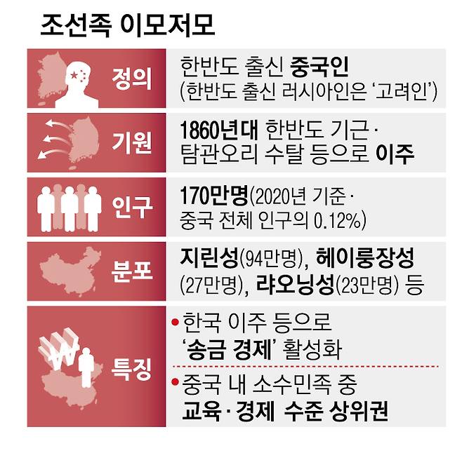 옌볜주는 1952년 설립 이래 한글 전용을 원칙으로 하되 한글과 한자를 병기할 때는 한글을 우선 표기하도록 했으나, 지난 7월 한자를 먼저 적도록 규정을 바꿨다. 2000년대 초까지만 해도 1000곳이 넘던 중국 내 조선족 초·중·고교는 200곳 정도만 남았다. 아예 자녀를 한족과 결혼시키고 그 2세를 한족으로 등록하는 ‘동화’ 현상도 늘고 있다. 황유복 베이징 중앙민족대학 교수는 “민족공동체 존망과 직결되는 전통 가치관 보존을 위한 민족언어·문화 교육이 필요하다”고 말했다.