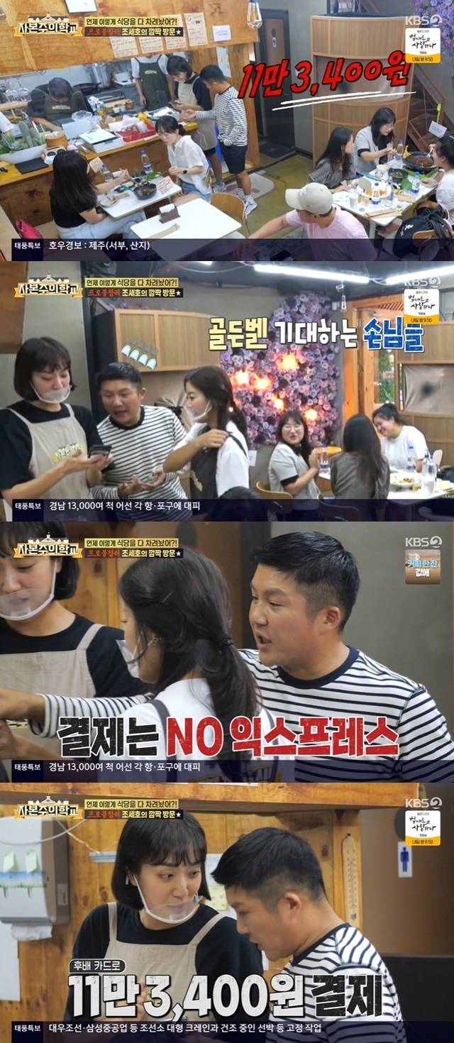 최종 결제 금액은 11만 3,400원. 이지현은 조세호의 카드를 보며 "부자다. 좋은 카드 쓴다"고 감탄했다. 하지만 정작 조세호의 카드는 결제가 되지 않았다. 결국 조세호는 후배 카드로 금액을 결제해 웃음을 자아냈다.