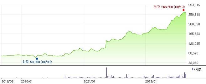 이 회사 주가가 고평가 구간에 들어섰다는 분석도 나온다. 올 상반기 매출 8853억원, 영업이익 238억원을 올렸다. 작년 상반기에 비해 24.3%, 122.2% 늘었다. 이 회사 실적을 반영한 주가수익비율(PER)은 156.24배에 달했다. 2차전지 종목인 에코프로비엠(92.64배)이나 카카오(22.41배)보다 PER이 높다. 미국 테슬라(94.98배)도 웃돈다.