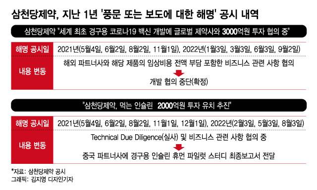 삼천당제약이 지난 1년여간 7번의 해명 공시를 낸 끝에 "코로나19 백신 개발 협의를 중단했다"는 소식을 전했다. 이제 관심은 같은 기간 8번 해명 공시를 낸 '인슐린 투자 유치' 향배다.