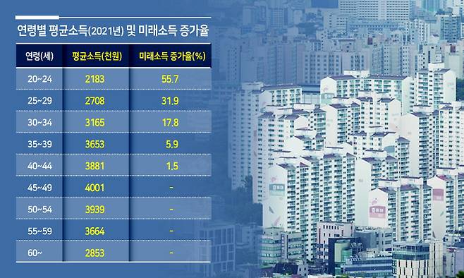 정부는 8월부터 생애최초 주택구매자에게는 주택담보대출 담보인정비율(LTV)을 80%로 적용해 최대 6억원까지 대출이 되도록 규제를 완화한 바 있다. 미래소득을 적용하지 않는 일반 차주의 경우 6억원을 대출(40년 만기, 연리 5%, 원리금균등분할상환) 받으려면 연간 8700만원을 벌어야 한다. 그러나 미래소득이 인정되면 20~24세는 5587만원, 25~29세는 6596만원, 30~34세는 7385만원, 40~44세는 8215만원만 벌어도 한도까지 대출이 가능하다.