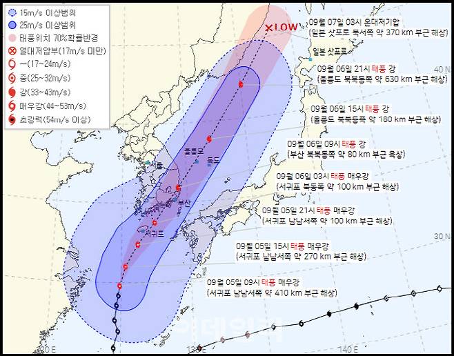 이동궤적이 정북방향을 향하며 직진하고 있어 제주도에 초근접하는 시기는 6일 새벽 1시께로 2시간 정도 빨라질 것으로 예상됐다. 경남 남해안 상륙 시점은 같은 날 오전 7시 전후로, 오후께 동해안을 빠져나갈 전망이다.