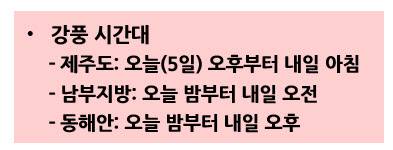 이를 우리에게 영향을 미칠 강풍이 부는 시간대로 환산해 보면 제주도는 오늘 오후부터 내일 아침, 남부지방은 오늘 밤부터 내일 오전, 동해안은 오늘 밤부터 내일 오후다.