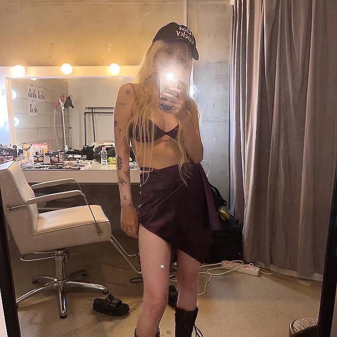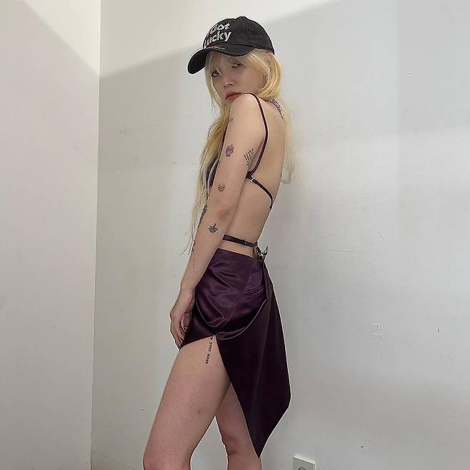 사진 속 신지민은 바디라인이 드러나는 보라색 의상을 입고 셀카를 촬영하고 있다. 팔과 다리에 여러 개의 작은 타투들이 새겨져 있어 눈에 띈다.
