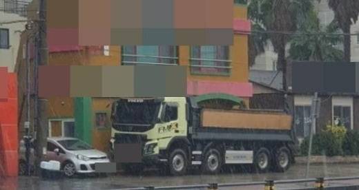 공개된 사진에는 비가 내리고 있는 제주도 내에 있는 상가 앞쪽에 덤프트럭들이 주차된 모습이 담겼다.