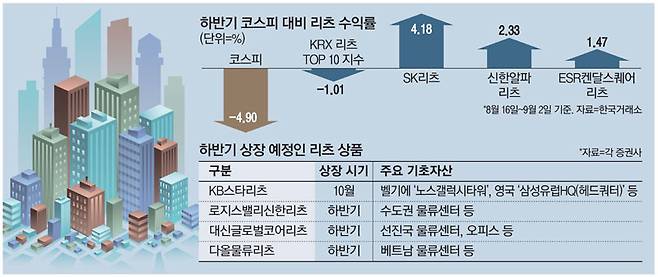 5일 한국거래소에 따르면 올해 하반기 들어 유가증권시장(코스피)이 지난달 16일 고점(2533.52) 대비 이달 2일까지 4.9% 하락하는 동안 KRX 리츠 TOP10 지수는 1.01% 하락하는 데 그치며 선방했다. 종목별로 SK리츠(4.18%), 신한알파리츠(2.33%), ESR켄달스퀘어리츠(1.47%) 순으로 플러스 수익률을 내며 선전했다.