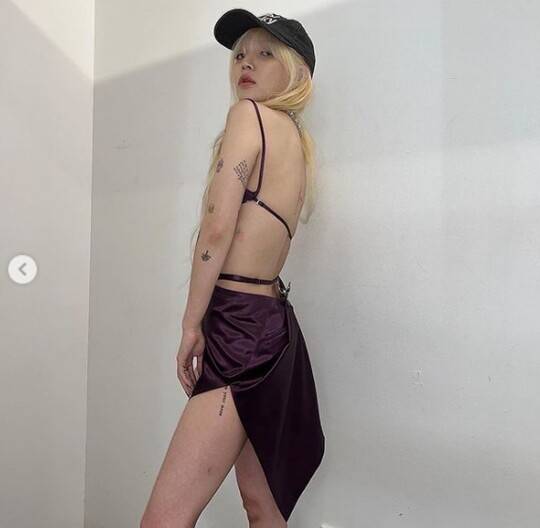 파격 노출로 드러난 지민의 군살 찾을 수 없는 가녀린 각선미와 함께 팔에 가득 새겨진 타투가 놀라움을 자아낸다.