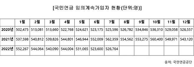 그동안 국민연금 임의계속가입자는 거의 매년 증가했는데, 건강보험 피부양자 소득기준 강화 조치가 본격적으로 알려진 지난해 연말부터 감소 추세로 돌아서면서 올해 7월 현재 임의계속가입자는 52만6천명으로 2020년 8월(52만6천명) 수준으로 줄어들었다.