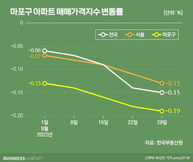 한국부동산원 주간 아파트 가격 동향조사에 따르면 지난달 29일 기준 마포구 아파트 매매가격은 이전 주보다 0.19% 하락했다. 같은 기간 전국 변동률은 –0.15%, 서울은 –0.13%였다. 지난 6월 둘째주 –0.01%에서 매주 낙폭이 커졌다.