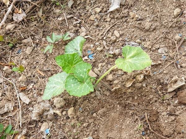 하지만 제발 호박은 안 그러기를 바라며 텃밭에 씨앗을 심었습니다. 다행히 텃밭에 심은 맷돌호박씨들은 여러 개 싹이 났습니다. 텃밭에 한 주만 심어 잘 키워도 호박을 무수히 거둘 수 있습니다. 작년에 그런 경험을 하였기에 처음에는 텃밭에 두 세 주만 심을 생각이었습니다. 그러다가 남은 모종들이 아까워 동네 어르신에게 빌린 가까운 밭에 열 주 가량 심었습니다.