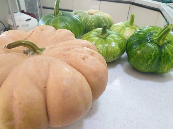 작년 봄 맷돌호박 모종 3주를 사다가 집 텃밭과 들녘 밭에 심었습니다. 아쉽게도 들에 심은 호박 모종 2주는 조금 자라다가 말라죽고 말았습니다. 반면 집 텃밭 호박 모종은 무럭무럭 자라나 호박 오십 덩이 남짓을 안겨 주었습니다. 작년에 딴 호박 중에는 늙은 호박들도 있었습니다. 늙은 호박은 속을 긁어내고 잘라서 호박죽을 끓여 먹었습니다.