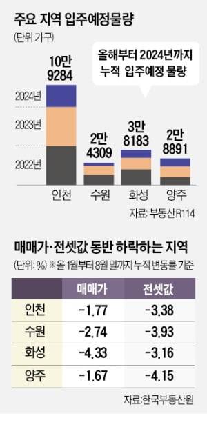 수도권 가격 하락세가 가팔라지고 있는 상황에서 대규모 입주 물량까지 겹친 지역의 부동산 시장에 ‘빨간불’이 켜졌다. 매수 심리 위축에 입주폭탄까지 맞으면 매매·전셋값 동반 하락세가 장기화되는 ‘설상가상’의 상황이 벌어질 수 있어서다. 미분양이 대량으로 쌓여가는 대구 같은 상황이 내년 각각 4만 가구, 1만 가구의 입주가 예정된 인천, 경기 수원 등 수도권에서 벌어질 수 있다는 관측이 나온다.