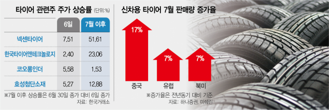 6일 한국거래소에 따르면 넥센타이어(002350)는 전날보다 560원(7.51%) 오른 8020원에 거래를 마쳤다. 7월 이후 주가 상승률은 51%를 넘는 수준이다. 종가 기준 8000원을 넘은 것은 지난해 9월 27일 이후 1년 만이다. 한국타이어앤테크놀로지(161390)도 2.40% 오르며 3거래일 연속 상승세로 마감했다. 7월 이후 23.06% 상승했다. 타이어 고무 내부의 섬유 보강재인 타이어코드를 생산하는 코오롱인더(120110)와 효성첨단소재(298050)는 각각 5.58%, 5.27% 상승 마감했다.