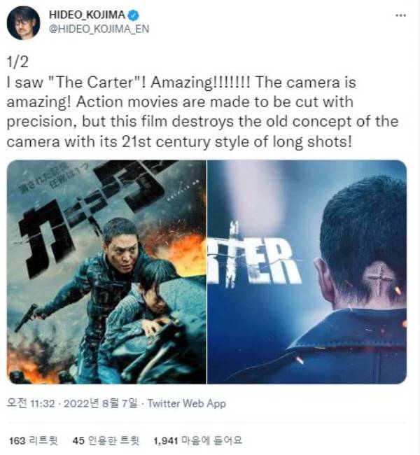 "'카터'를 봤다. 대단하다. 21세기 스타일의 롱샷으로 카메라의 오래된 개념을 파괴했다."