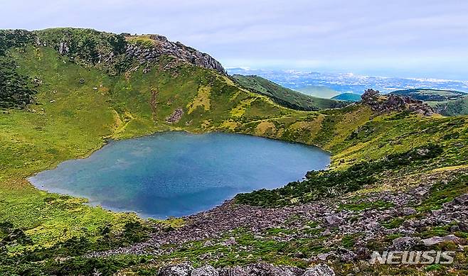 [제주=뉴시스] 우장호 기자 = 7일 제주 한라산 백록담 화구에 물이 차 호수를 이루고 있다. 제11호 태풍 '힌남노'의 직·간접적인 영향으로 많은 비가 내리면서 백록담이 만수(滿水)를 이뤘다. 분화구 전체가 아니라 바닥 대부분이 물에 잠기면 만수로 본다. (사진=독자 김경미씨 제공) 2022.09.07. woo1223@newsis.com