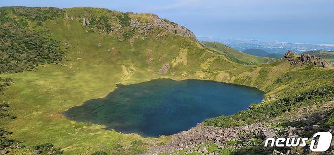 (제주=뉴스1) = 제11호 태풍 '힌남노'의 영향으로 한라산에 1000㎜ 이상의 비가 내린 다음날인 7일 백록담이 만수위를 기록하고 있다. (독자 윤경석 씨 제공) 2022.9.7/뉴스1