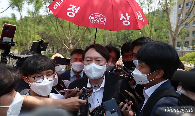 | ▲ 2021년 6월 9일, 윤석열 전 검찰총장이 서울 중구 남산예장공원 개장식에 참석하고 있다. 사진 가운데에 팬클럽 '열지대'의 홍보용 빨간 우산이 보인다. |