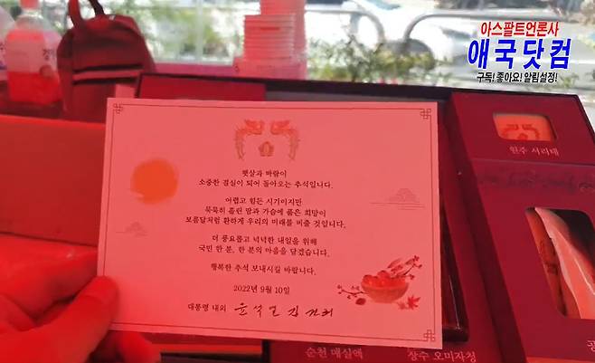 "어렵고 힘든 시기이지만 묵묵히 흘린 땀과 가슴에 품은 희망이 보름달처럼 환하게 우리의 미래를 비출 것입니다. 대통령 내외 윤석열 김건희."