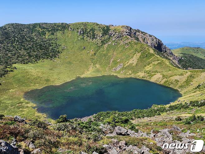 (제주=뉴스1) = 제11호 태풍 '힌남노'의 영향으로 한라산에 1000㎜ 이상의 비가 내린 후인 7일 백록담이 만수위를 기록하고 있다.(독자 강영근씨 제공) 2022.9.7/뉴스1