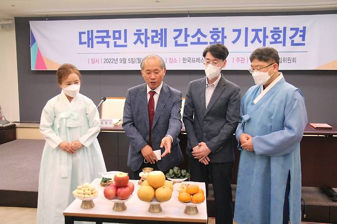 | ▲ 최영갑 성균관 의례정립위원회 위원장(왼쪽 두 번째)이 5일 서울 중구 한국프레스센터에서 '차례 간소화' 방안을 발표 후 간소화 방안대로 차린 차례상을 지켜보고 있다. 2022.9.5 [성균관 의례정립위원회 제공] |