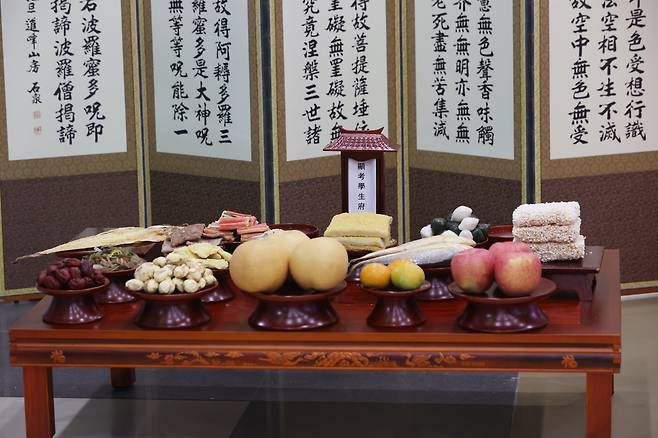 | ▲ 성균관 의례정립위원회가 5일 서울 중구 한국프레스센터에서 '차례 간소화' 방안을 발표했다. 사진은 간소화 방안대로 차린 9가지 음식의 차례상. 2022.9.5 |