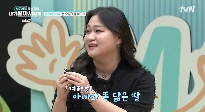 김은서는 "아직도 저를 볼 때마다 '붕어빵' 얘기를 많이 하신다. 그때보다 많이 컸는데 아직도 많이 닮았다고 하셔서 고민이다"고 했고 "아빠를 닮았다는 사실을 별로 좋아하지는 않는 것 같다"는 김응수 말에 "그리 좋지만은 않지만 노력하겠다"고 씁쓸한 웃음을 지었다. (사진=tvN '내가 알아서 할게' 캡처)