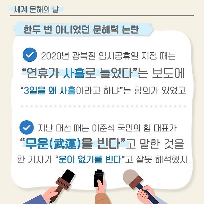 지난 대선 때는 이준석 국민의힘 대표가 대선 출마를 선언한 안철수 당시 국민의당 대표에게 "무운(武運·전쟁 따위에서 이기고 지는 운수)을 빈다"고 말한 것을, 한 방송사 기자가 "운이 없기를 빈다"고 잘못 해석해 비판이 쏟아졌습니다.