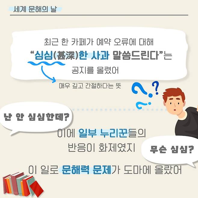 매우 깊고 간절하다는 뜻의 '심심(甚深)하다'를, 하는 일이 없어 지루하고 재미가 없다는 것으로 해석해 카페 측을 비판한 것을 두고 논란이 일었죠.