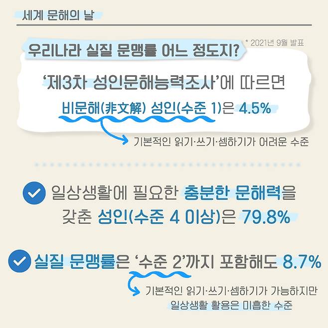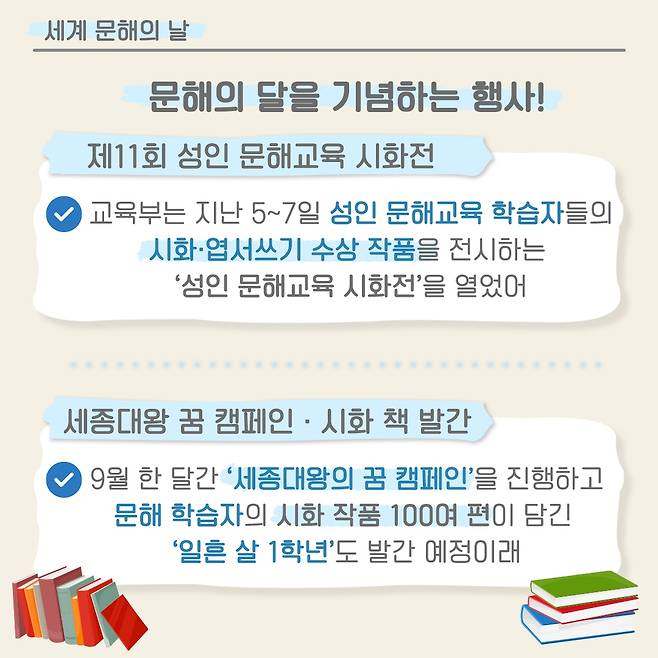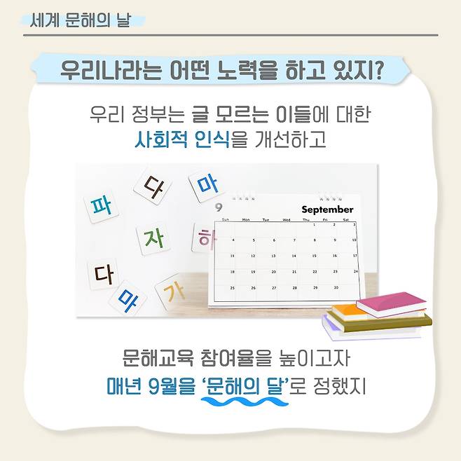 한편 우리 정부는 글을 모르는 이들에 대한 사회적 인식을 개선하고 문해교육 참여율을 높이고자 매년 9월을 '문해의 달'로 정해 홍보하고 있는데요.