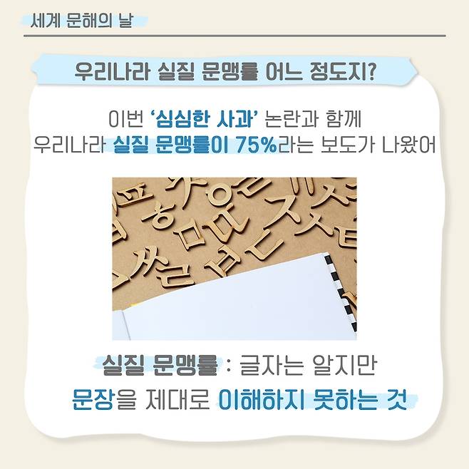 한편 이번 '심심한 사과' 논란과 함께 우리나라 실질 문맹률이 75%나 된다는 보도가 나오기도 했는데요.
