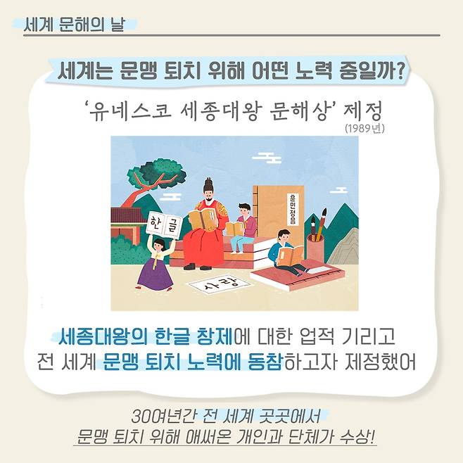 세계에서 가장 과학적인 문자로 인정받는 한글을 사용하는 우리나라는 세종대왕의 한글 창제에 대한 업적을 기리고 전 세계 문맹 퇴치 노력에 동참하고자 1989년 '유네스코 세종대왕 문해상'을 제정했는데요.